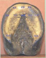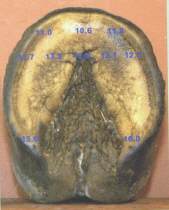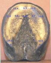 Zusätz1ich untersuchten wir die genaue Morphologie der dermalen und epidermalen Sohle der Hufe von Wildpferden und domestizierten Vollblutpferden. Diese Studie ergab einen signifikanten Unterschied in der Sohlendicke(Bilder1) zwischen den drei Populationsgruppen aus verschiedengründigen Lebensräumen. Wildpferde aus hartgründigen Lebensraumen hatten durchschnittlich eine dickere Sohl als Wildlebende aus weichgründigen Lebensräumen Außerdem hatten beide Wildpferdepopulationen eine höhere durchschnittliche Sohlendicke als die Vollblutpferde aus menschlicher Obhut. Die Sohle war am Rand nahe der Hufwand dicker als in der Mitte. Dies stimmt mit den Ergebnissen der Belastungsstudie überein, die darauf hinwies, dass eine erhöhte Sohlendicke mit den Bereich stärkster Lastaufnahme und damit auch höchster Abnutzung korrelierte. Die Daten implizieren, dass es als Reaktion auf biomechanische Rückmeldungs-Mechanismen verschiedene Wachstumsraten des Sohlenhorns innerhalb der Sohlenfläche geben könnte.